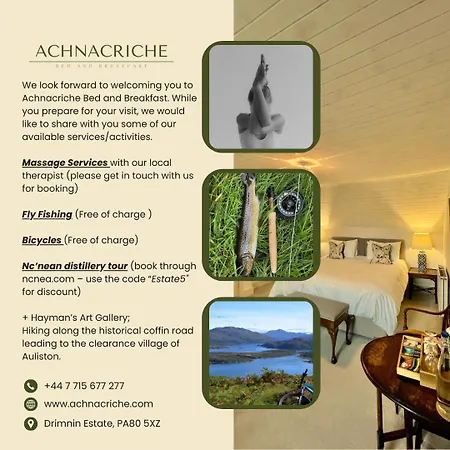 Gästerna som bor på hotellet kommer att befinna sig ungefär 15 minuters bilresa från Mull Museum. Busshållplatsen Slipway är belägen invid boendet. Den närmaste flygplatsen är Oban Connel, ca 60 km från Achnacriche B&B.